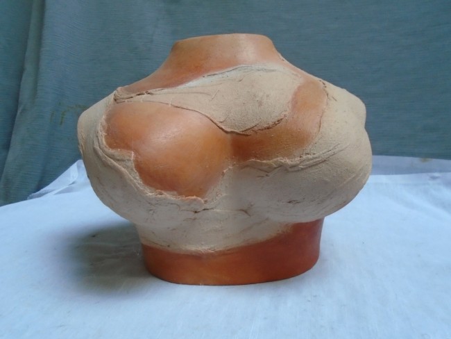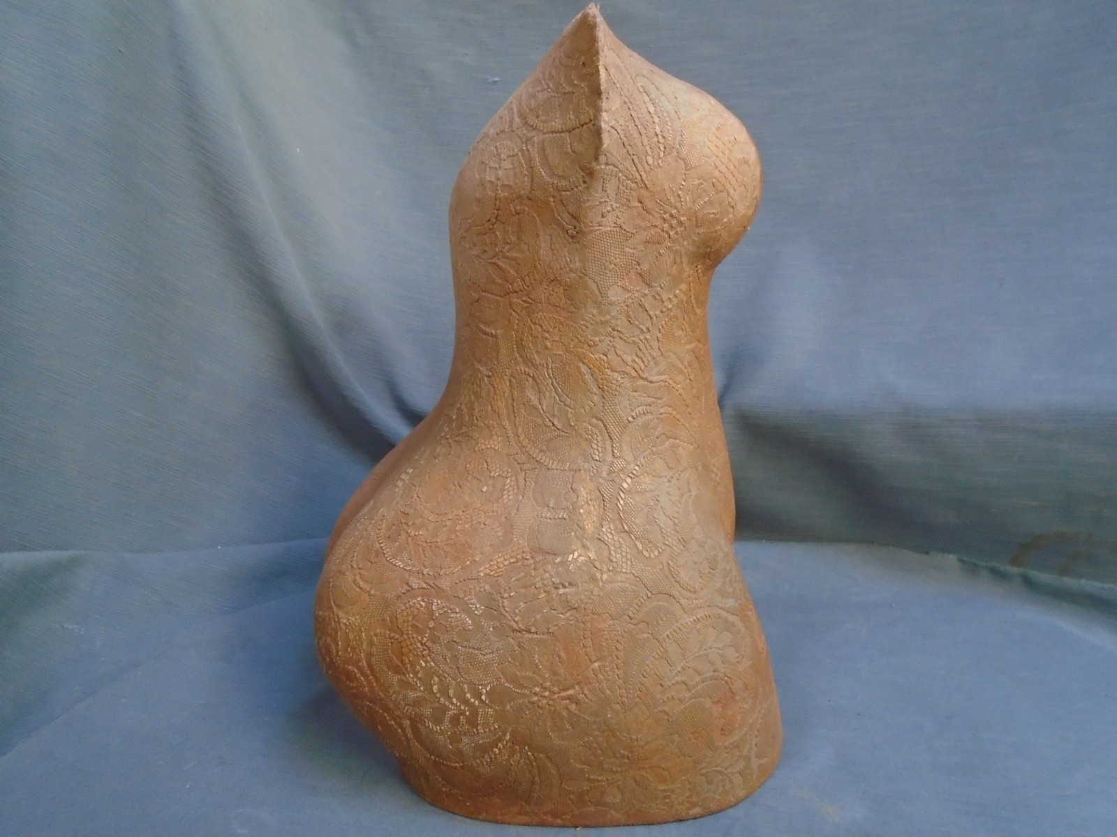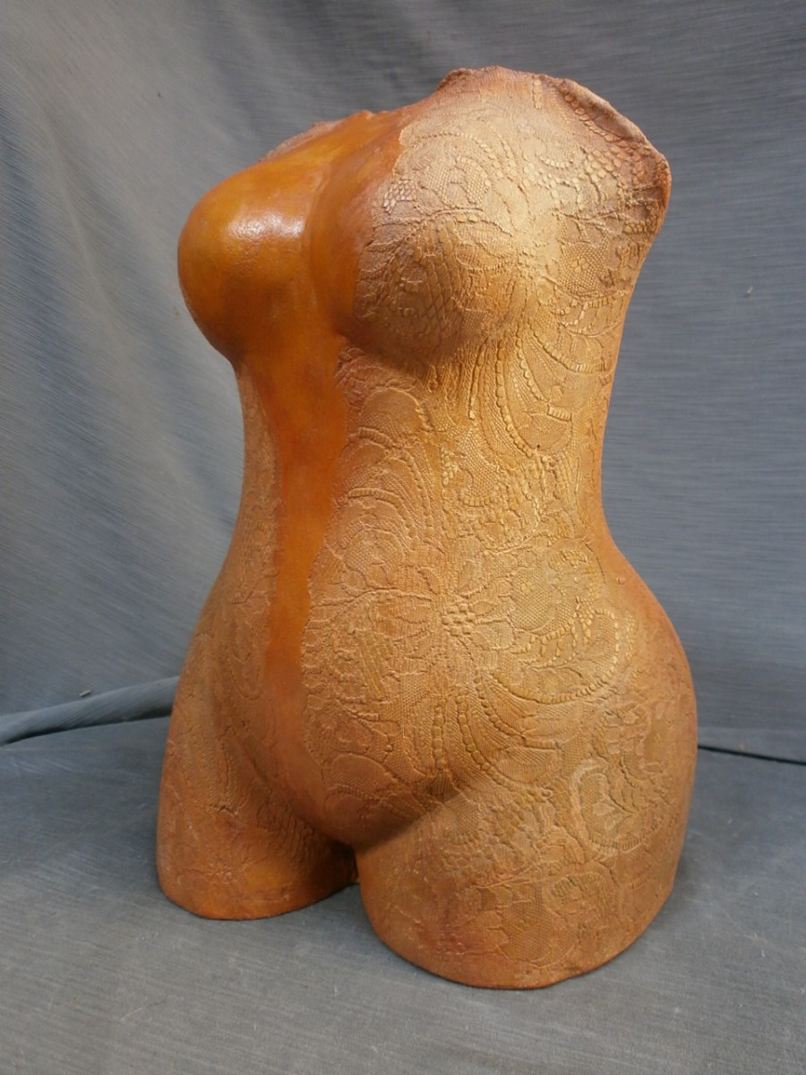 Sculptures terre cuite patinée ou recouverte de tissu façon patchwork et bronze ,pièce unique,symbolisant le corps féminin le couple